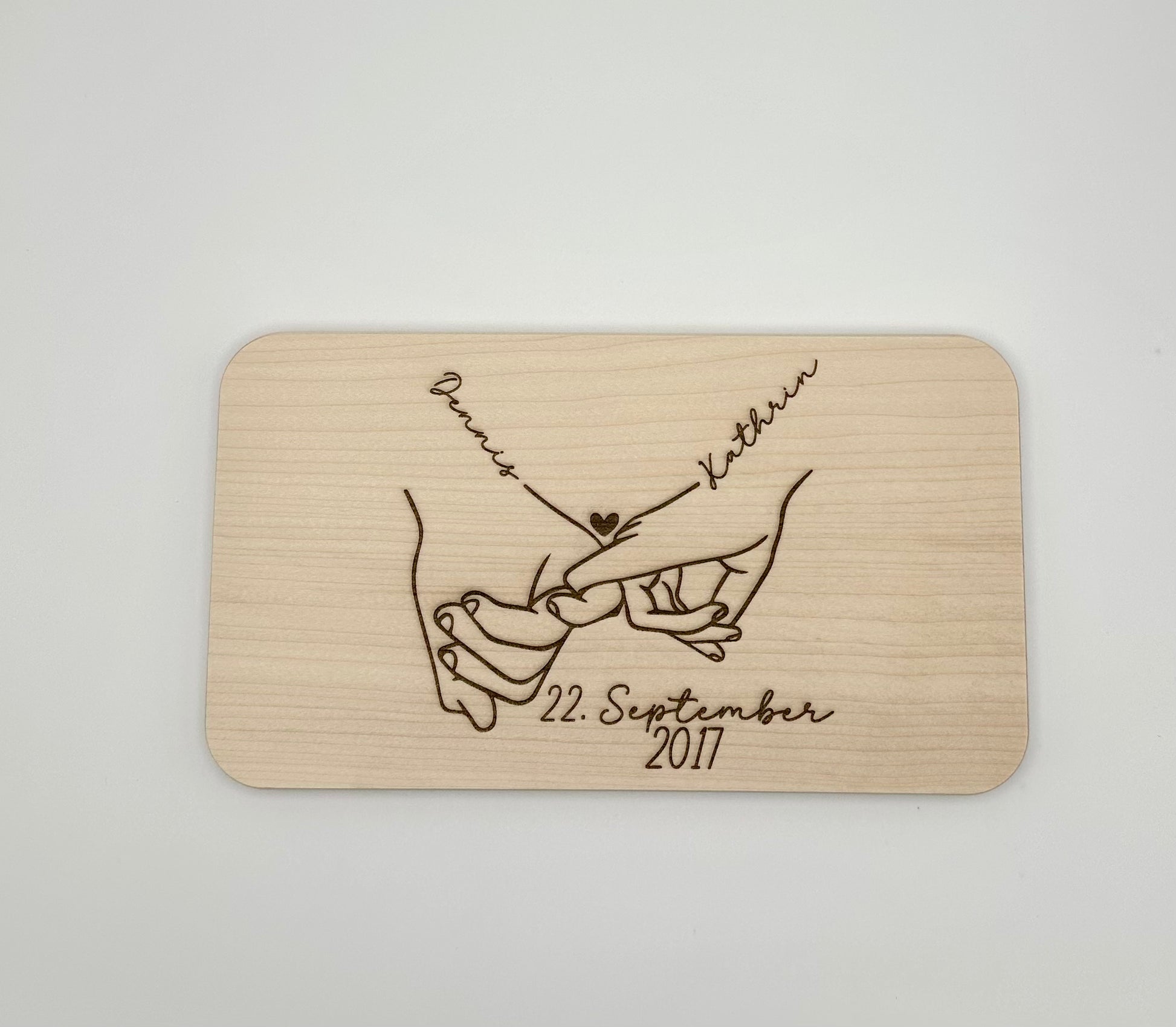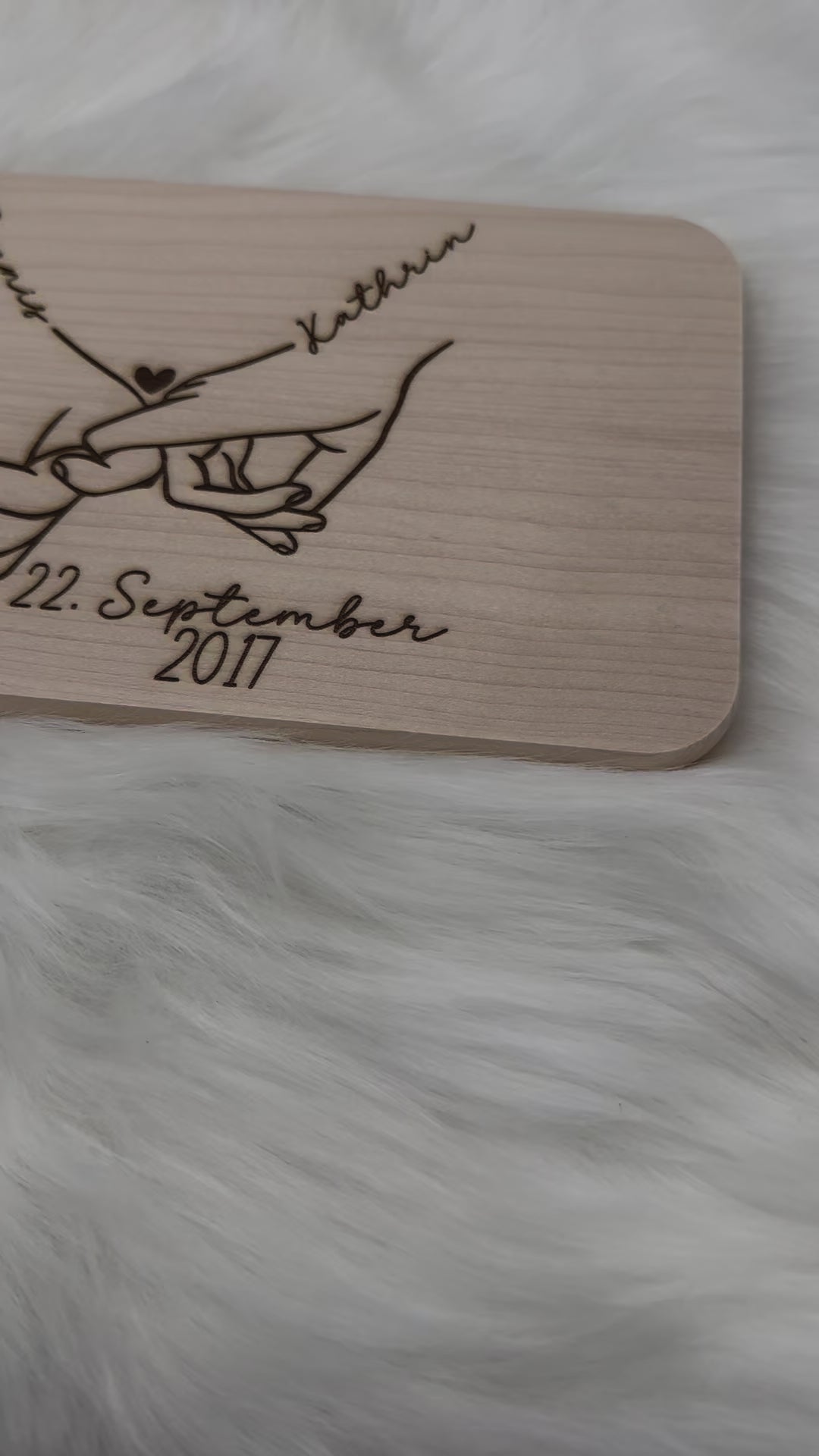 Du hast die Möglichkeit dein Brett mit den Namen und dem Datum der Hochzeit, Jahrestag etc. gravieren zu lassen.