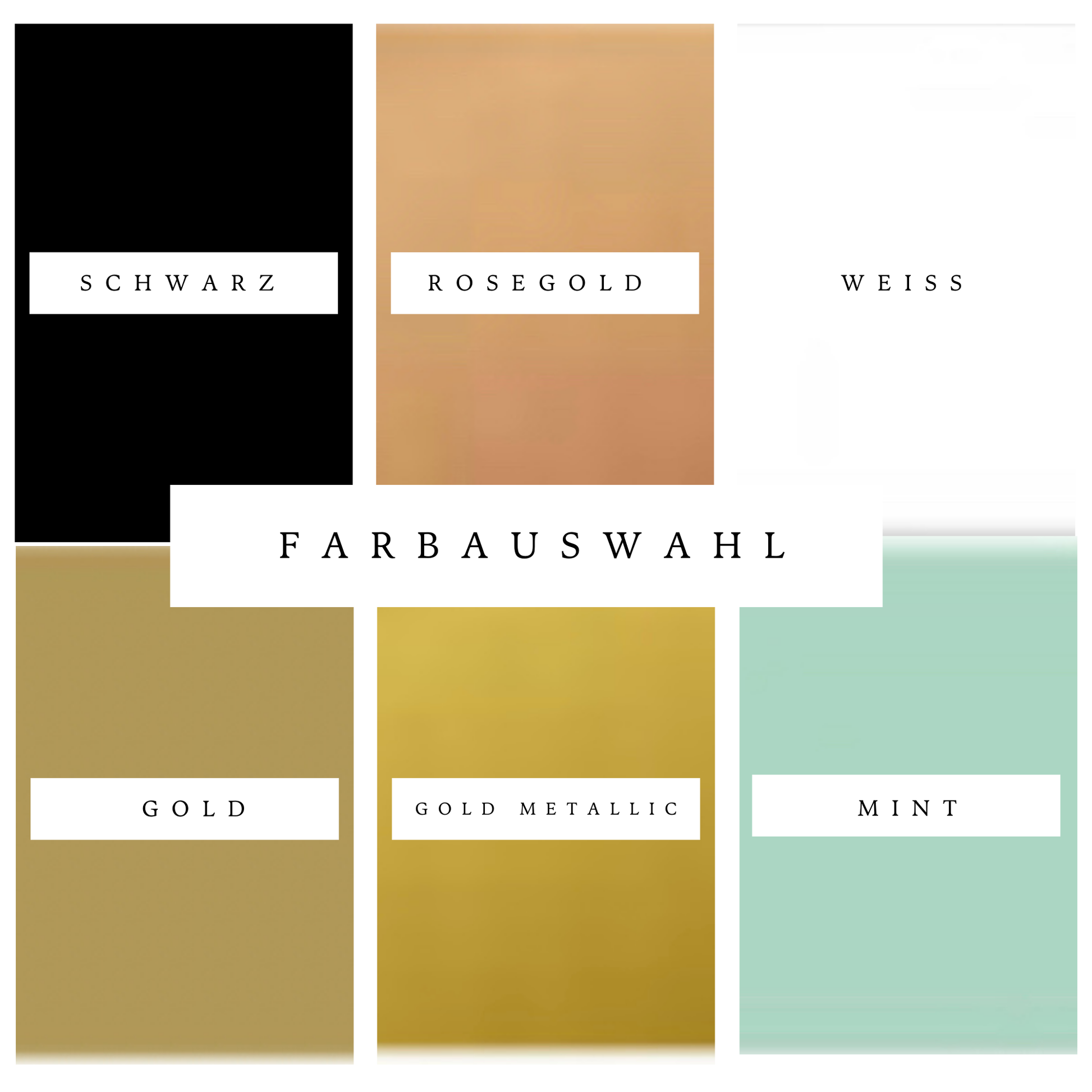 Außerdem kannst du zwischen 6 verschiedenen Farben für den Aufdruck wählen - siehe Farbkarte.