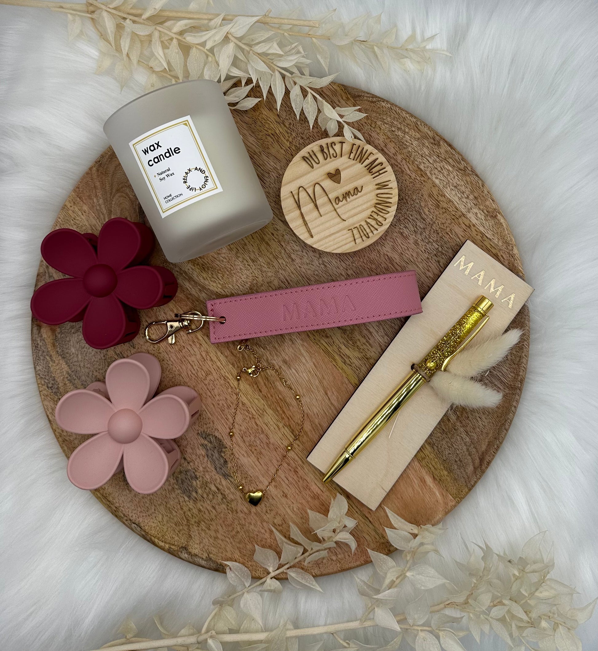 – 1 Duftkerze (150g Wachs) mit dem Spruch „Mama, du bist wundervoll“ (Duft: Fresh Flower)