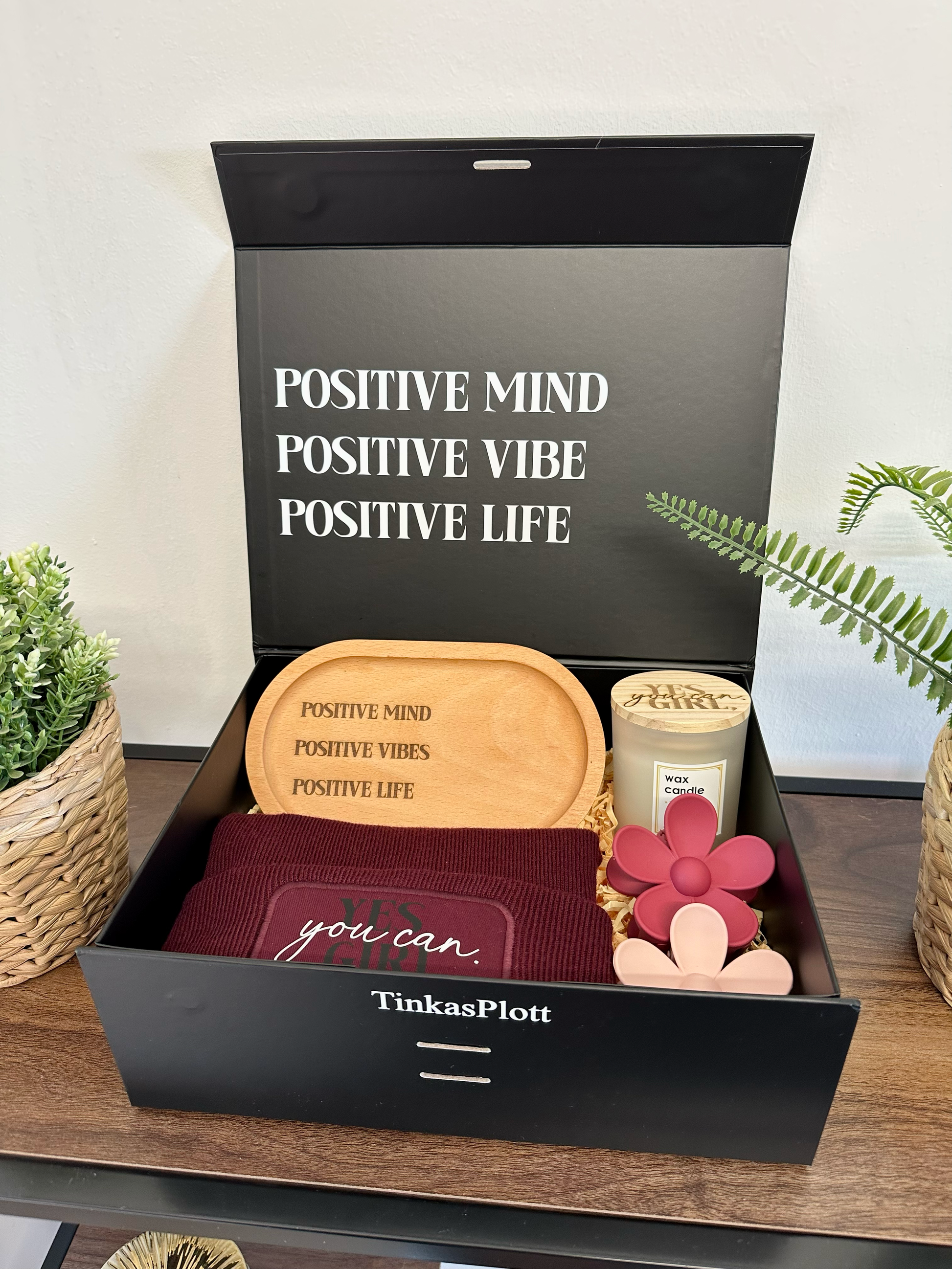 Die Box misst 29 x 22 x 105 cm und ist mit feinen Papierschnipseln ausgelegt. Alle Produkte sind sicher eingebettet und optisch ansprechend arrangiert. Auf dem Innendeckel steht erneut der motivierende Spruch – für einen besonders schönen Moment beim Öffnen.