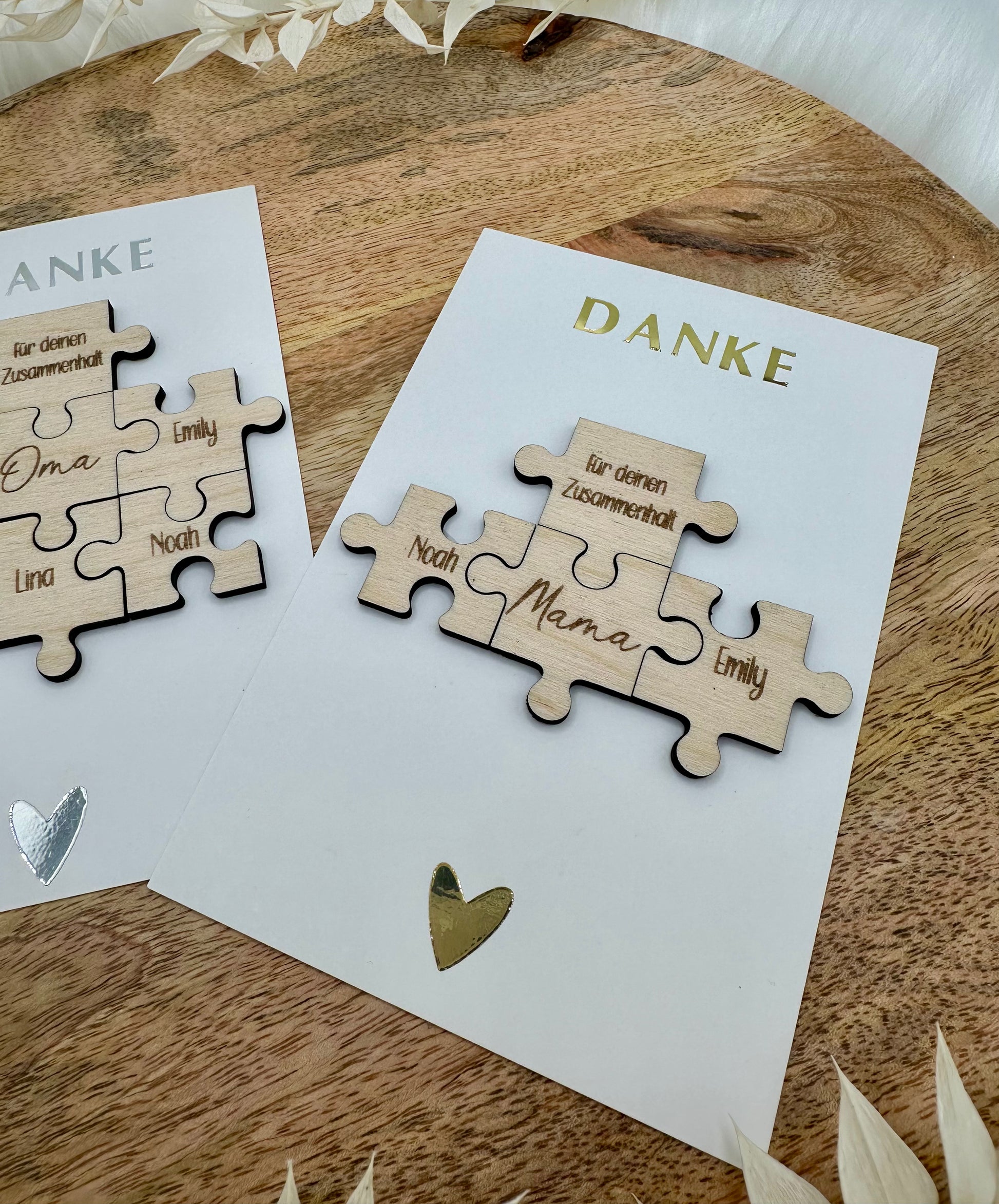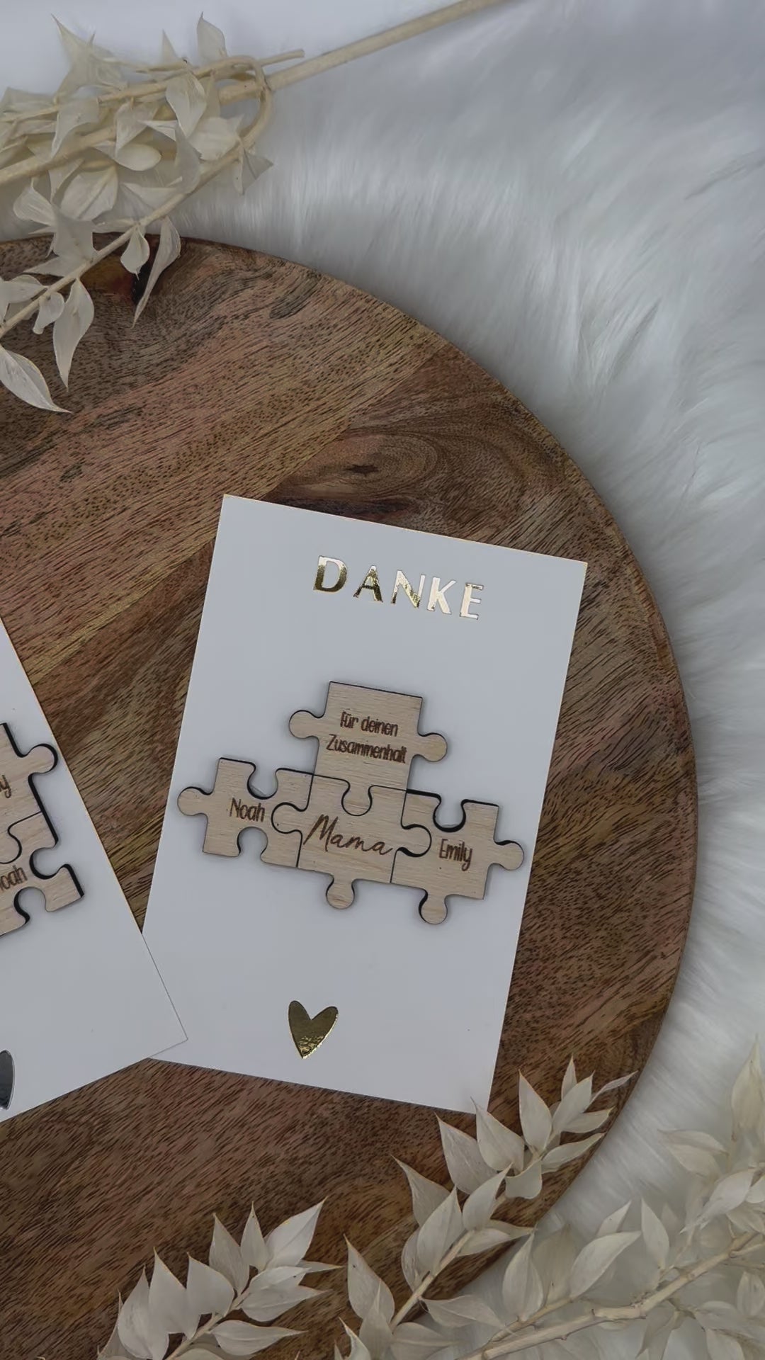 Ganz oben auf der Karte steht das Wort Danke, das in edler Gold- oder Silberprägung schimmert. Darunter befindet sich das Highlight der Karte: Holzelemente, die zusammen ein Puzzle ergeben. Auf dem ersten Puzzlestück steht der Satz für deinen Zusammenhalt, gefolgt vom Namen der beschenkten Person – zum Beispiel Mama oder Oma. Die nächsten Puzzleteile tragen die Namen der Kinder und machen die Karte zu einem ganz persönlichen Geschenk.