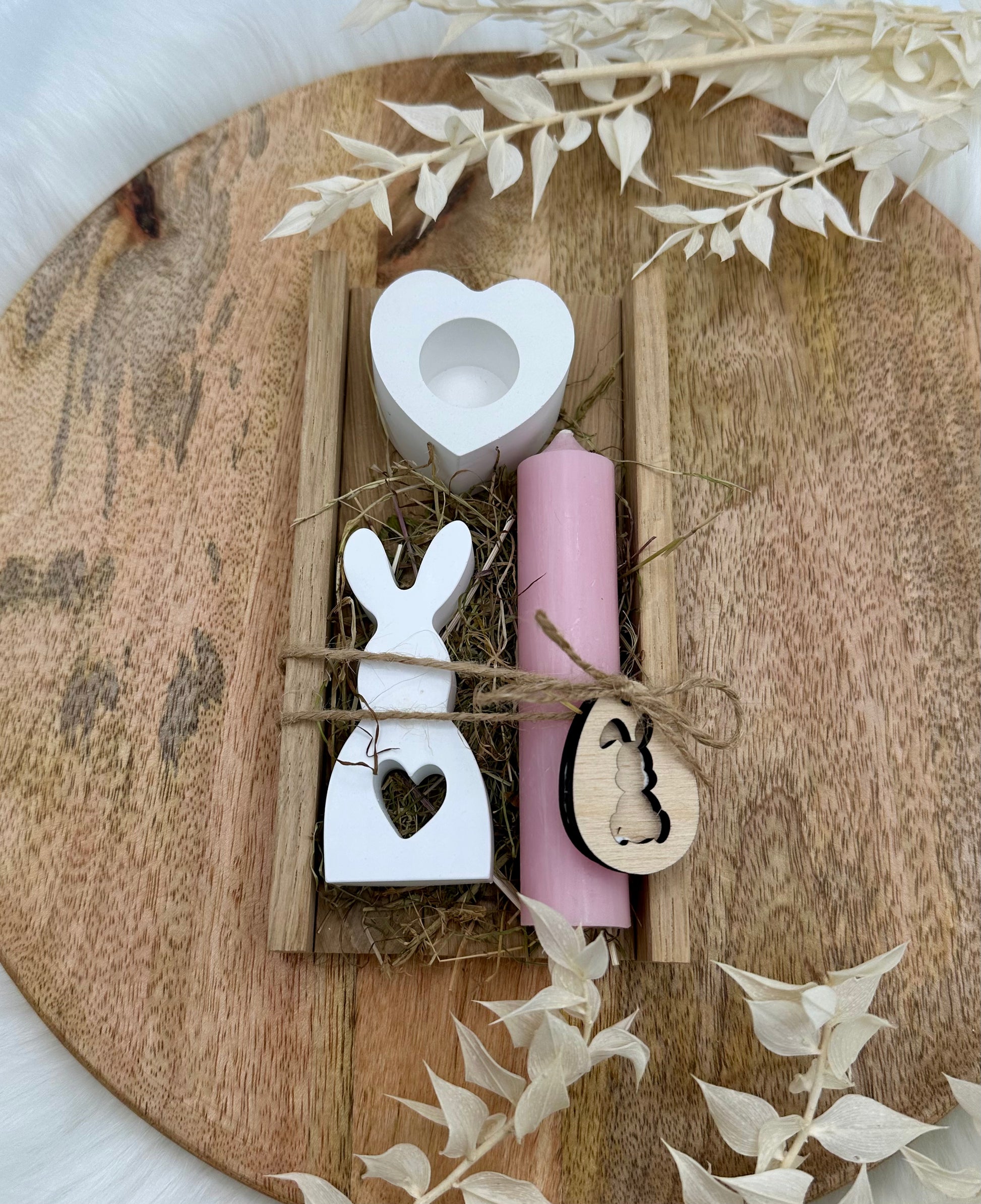 Geschenkbox zu Ostern – Holzgestell mit Gießpulver-Hase, Kerze & Kerzenhalter
