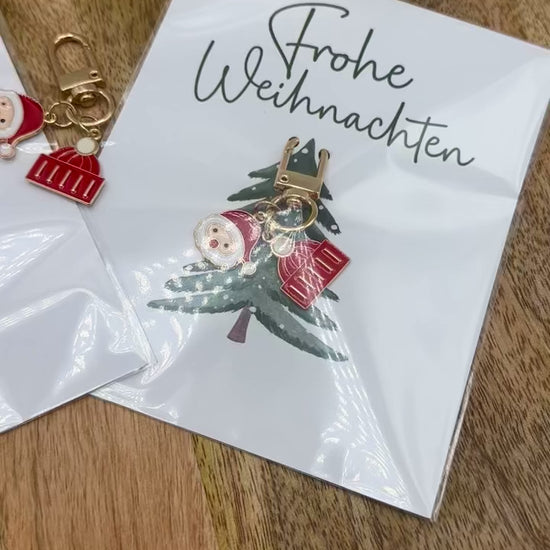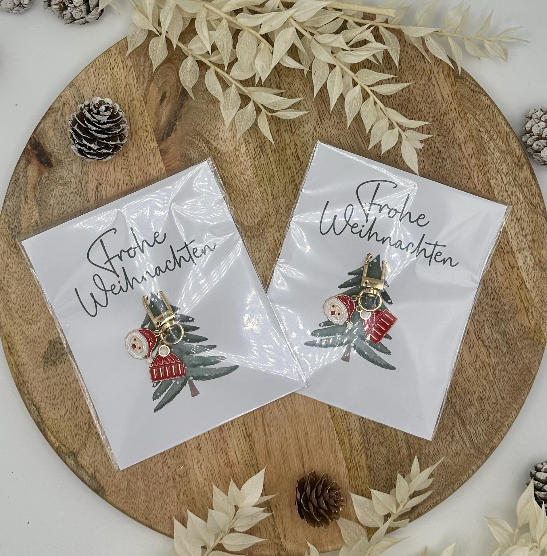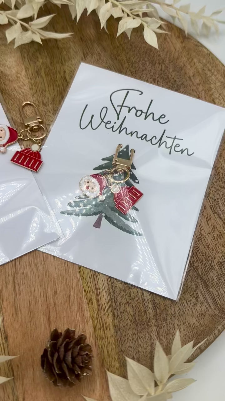Dieser liebevoll gestaltete Schlüsselanhänger ist mit zwei winterlichen Charms verziert – einem Nikolaus und einer süßen Mütze. Er wird auf einer von mir entworfenen, gedruckten und geschnittenen Karte befestigt und in Folie verpackt – so ist er direkt bereit zum Verschenken.